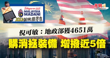 (八打靈再也25日訊)地方政府發展部長倪可敏指出,該部今年獲得4651萬令吉撥款採購消拯裝備和器材,以加強消拯隊的救援行動和天災管理,比2022年增加將近5倍之多。