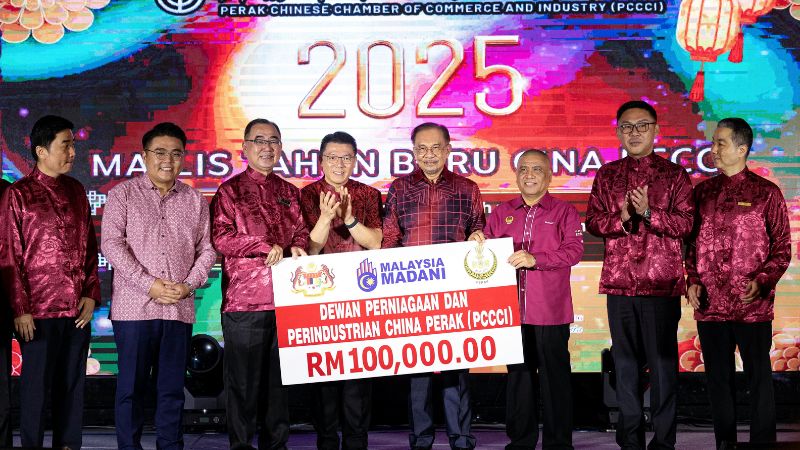 Perdana Menteri Datuk Seri Anwar Ibrahim (lima, kiri) dan Menteri Perumahan dan Kerajaan Tempatan, Nga Kor Ming (empat, kiri) menyaksikan majlis penyerahan sumbangan dari Kementerian Perumahan dan Kerajaan Tempatan yang disampaikan oleh Menteri Besar Perak Datuk Seri Saarani Mohamad (tiga, kanan) kepada Presiden Dewan Perniagaan dan Perindustrian Cina Perak (PCCCI) Datuk Liew Chee Ming (tiga, kiri) pada sambutan Tahun Baharu Cina anjuran PCCCI hari ini. Foto Bernama
