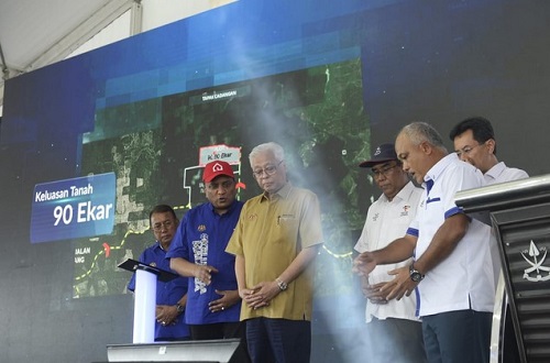 ISMAIL SABRI (tiga dari kiri) menyempurnakan majlis perasmian pecah tanah Program Perumahan Rakyat (PPR) Bera di Rejimen Ke-34 Artileri Diraja Kem Bera di Bera hari ini.