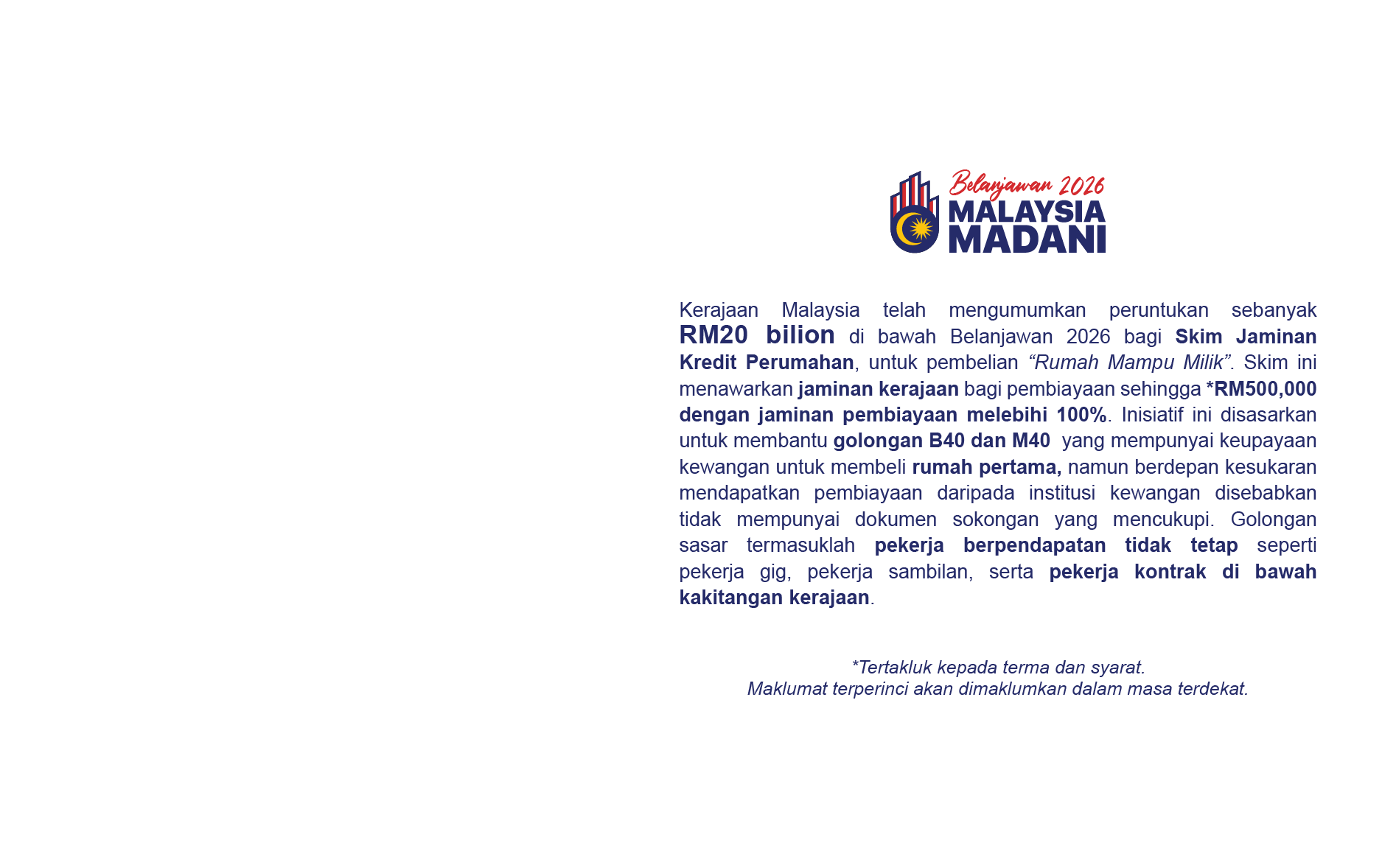 *Jaminan pembiayaan melebihi 100% diatas jumlah pembiayaan (termasuk jumlah pembiayaan pokok, MRTA/MRTT, LTHO, yuran guaman dan yuran penilaian). *Tertakluk kepada pembiayaan tidak melebihi RM500,000